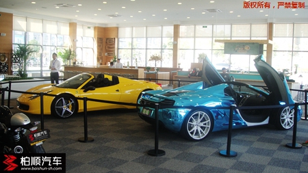 場內(nèi)由我們柏順家族的電鍍藍(lán)的邁凱輪P1和法拉利458Spider坐鎮(zhèn)